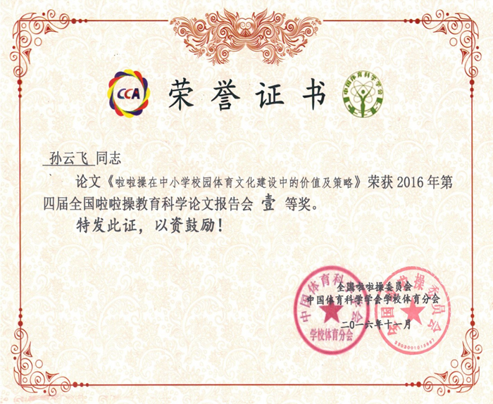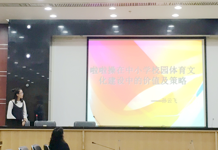 本网讯(文/图 体育学院研究生 孙云飞)为了进一步加强啦啦操项目理论体系建设,提高学术研究水平,由国家体育总局体操运动管理中心和中国体育科学学会学校体育分会主办的第四届全国啦啦操教育科学论文报告会在江苏无锡举行,11月5日,我院2015级研究生孙云飞同学在导师姜晓珍教授的指导下,在大会上作了题为《啦啦操在中小学校园体育文化建设中的价值及策略》的专题报告,其论文被第四届全国啦啦操教育科学论文报告会录取为专题报告论文,并荣获论文一等奖。