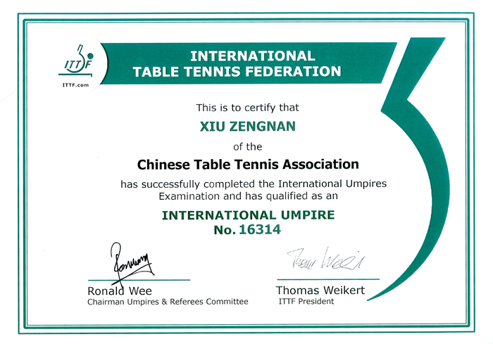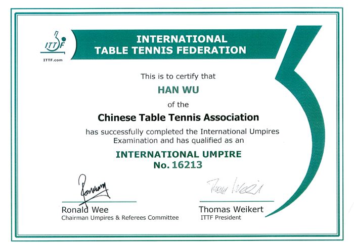 本网讯(文/图 修增楠)近日,我校体育学院韩武、修增楠两位教师获得国际乒乓球联合会(International Table Tennis Federation)颁发的乒乓球“国际级裁判员(International Umpire)”证书,这是我校继霍日查老师之后,新晋的两位国际级裁判员。
