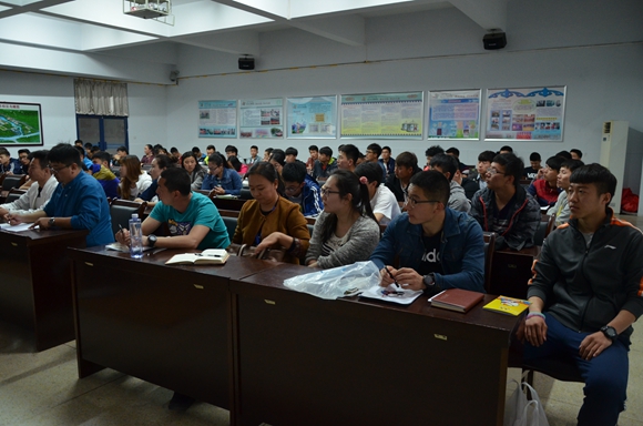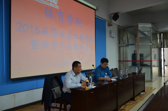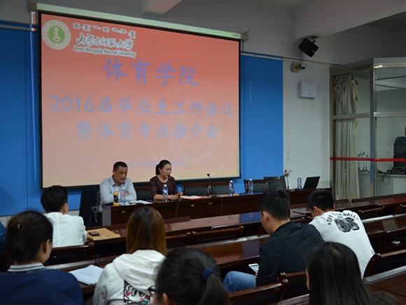 本网讯(文/图 姚辉)为进一步推进毕业生就业指导工作,提高我院毕业生的就业率,我院于4月13日中午在体育馆报告厅举行2016届毕业生工作会议暨体育专业推介会。学院党总支副书记韩武、学生工作办公室主任孟亚彪出席会议,2016届毕业生及部分其他年级学生参加此次会议。会上邀请到了内蒙古奥飞体育发展有限公司、龙凤健身培训中心、兄妹游泳俱乐部(均是体育专业毕业生创立的公司)等用人单位进行了推介。
