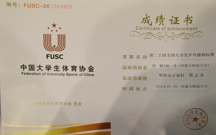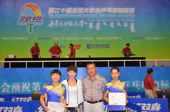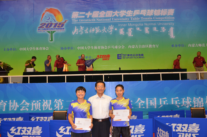 本网讯(文/图 韩武;修增楠)由中国大学生体育协会主办,中国大学生体育协会乒乓球分会、内蒙古自治区教育厅协办,我校承办的全国大学生最高级别的乒乓球赛事——第二十届全国大学生乒乓球锦标赛于8月24日在我校落下帷幕。 来自全国38所高校的大学生运动员们在甲、乙两个组别的团体和单项比赛中展开激烈角逐。我校代表队由体育学院党总支副书记韩武任领队,教练员康晨冉和12名运动员(7男、5女)组成。我校运动员赵一凡、唐颖在甲组女子双打中面对强敌,发扬奋力拼搏的优秀品质,最终获得第三名。