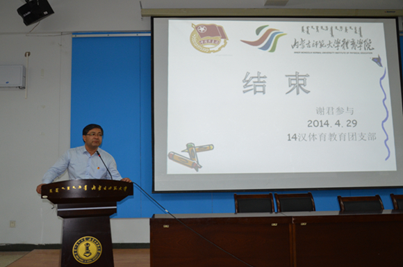 本网讯(文/图体育学院学生会 姚辉、侯俊林)为更好地组织我院团员青年认真学习习近平总书记系列重要讲话精神—“四进四信”活动的总体思路和具体内容、落实校团委关于开展“四进四信”学习活动的工作部署,我院团总支于今天下午14点30分在体育学院多功能报告厅组织2014级体育教育汉班团支部开展“四进四信”主题团日活动。校团委文体部部长王丹、国际交流学院团总支书记博音太及我院党总支书记铁木尔、党总支副书记韩武、学工办主任孟亚彪、团总支书记敖永胜以及体育学院各班班长、书记及团小组长观摩了本次团日活动。