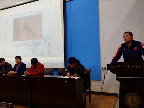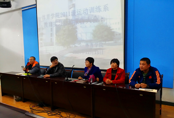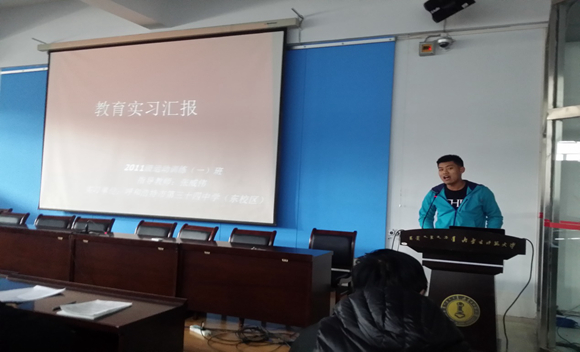 本网讯(文/图 体育学院2011级运动训练专业姚一帆)体育学院2011级运动训练专业教育实习总结报告会于11月13日下午14点30分在体育馆二楼多媒体报告厅召开,学院党总支书记铁木尔,副院长包呼格吉乐图,运动训练系系主任姜晓珍、副主任白银桩,校内外实习管理教师徐慧颖、贾佳、张慧升,以及我院2011级、2012级运动训练专业全体学生参加实习总结报告会。