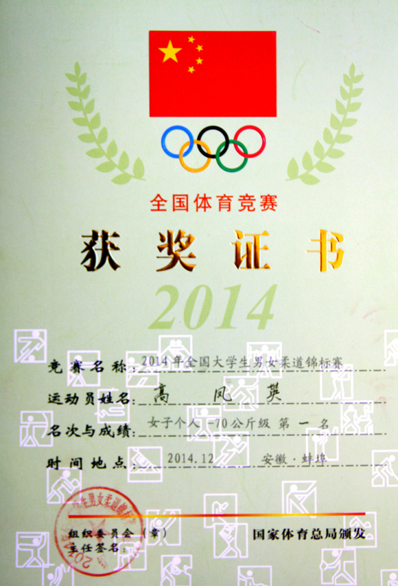 高凤英获得女子个人冠军证书