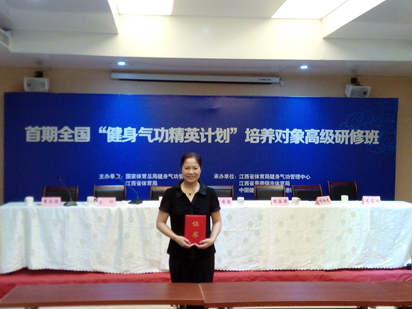 为做好“健身气功精英计划”培养对象的培养工作,根据年度工作计划安排,健身气功管理中心于7月3日至9日,在江西景德镇市举办了首期“健身气功精英计划”培养对象高级研修班,我院张彩琴副教授参加了首期培训。为支持和帮助各地建设技术骨干人才队伍,每个省区市可申报1-2名学员旁听“精英计划”培养对象的集中培训课程。我院2014届民族传统体育硕士研究生刘宇星由内蒙古自治区健身气功管理中心选派旁听了本次高级研修班的全部课程。