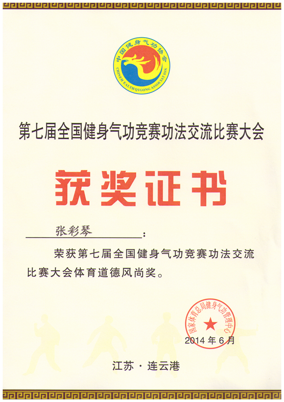 另悉,六月份在江苏连云港举办的第七届全国健身气功竞赛功法交流比赛大会上,张彩琴老师荣获裁判员“体育道德风尚奖”。