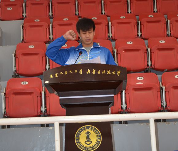 开幕式上运动员代表刑森荣(物理与电子信息学院)、裁判员代表张浩(体育学院)分别宣誓。开幕式后我院2011级体育教育汉班马肃、吕昊与体育学院健美操队分别带来了武术、健美操表演,随后内蒙古师范大学街舞社团也为本届运动会带来了精彩表演。本次运动会为期两天,在两个校区举行,将“走下网络、走出宿舍、走向操场”推向高潮。据悉,全校23支代表队共1000余名运动员,将在本次比赛中大显身手,挥洒汗水,创造辉煌。