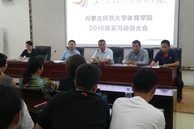 为进一步做好2016级学生毕业实习工作,引导学生做好实习前的各项准备工作,推进实习工作的顺利开展,体育学院于2019年8月29日下午召开2016级实习动员大会。出席此次会议的有体育学院党总支书记韩武、副院长李凤新教授、体育教育系主任邵国华副教授、运动训练系主任贾佳副教授、社会体育指导与管理系主任张晓英,班主任张慧升、郑松玲、格日乐图,实习指导教师马少坚副教授、陈桂凤副教授、布和朝鲁、张威伟、陈永红、刘楠及2016级全体学生。邵国华老师主持会议。